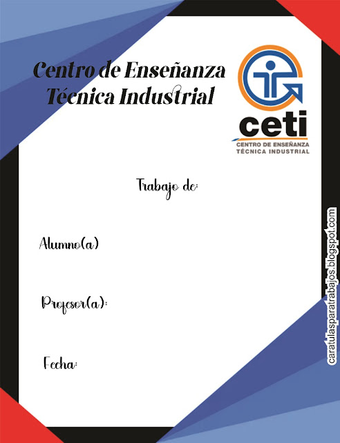 Portada con un borde que contiene decoración en negro, rojo y azul degradado. Logotipo del ceti y los espacios necesario para llenar con los datos de los educandos.